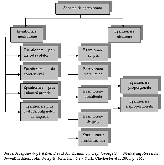 j. Stabilirea schemei de esantionare. Este decisiva pentru asigurarea reprezentativitatii esantionului si are in vedere modalitatea concreta de precizare a persoanelor ce vor fi intervievate. Exista mai multe posibilitati[9] (vezi figura 1.), cele mai des utilizate fiind: