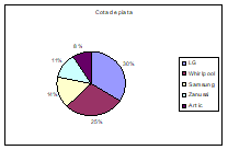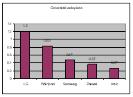 Se poate observa ca firma care produce frigiderele LG detine cea mai mare cota de piata si este urmata de producatorii celorlalte marci : Whirlpool, Samsung, Zanussi si Artic.