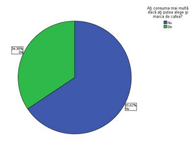 Relevanta acestei intrebari este aceea de a stabili daca consumul de cafea ar creste in cazul in care studentii si-ar putea alege marca de cafea. In cazul realizarii unui studiu viitor am recomanda introducerea unor intrebari referitoare la marciile de cafea care ar trebui introduse in automate. S-a stabilit ca 34,38% ar consuma mai multa cafea, in schimb ce 65,62% nu ar consuma mai multa cafea daca si-ar putea alege cafeaua.