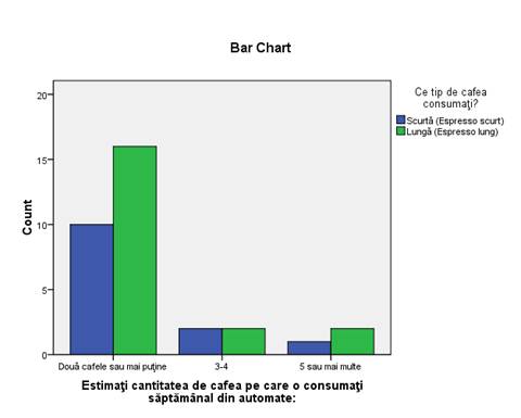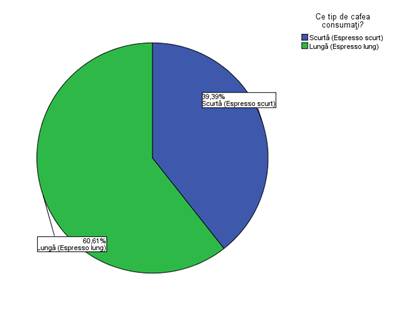 Cu ajutorul acestei intrebari estimam cantitatea de apa si de cafea care trebuie pus in fiecare recipient din fiecare automat pentru a aprecia perioada de timp la care trebuie facuta aprovizionarea automatelor. Astfel s-a aflat ca marea majoritate a populatiei statistice bea espresso lung 60,61%, in timp ce restul de 39,39% bea espresso scurt.