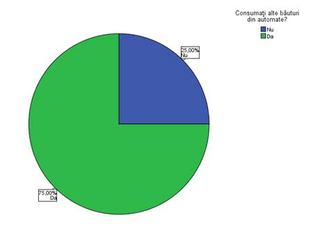 Menirea acestei intrebari este de a afla daca respondentii consuma si alte bauturi din automate,pentru a afla si succesul acestora in randul clientiilor , fiind in acelasi timp si o intrebare filtru. S-a aflat ca 75% consuma si alte baturi din automate, in timp ce restul de 25% nu consuma.