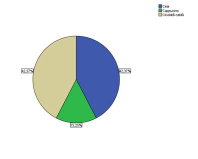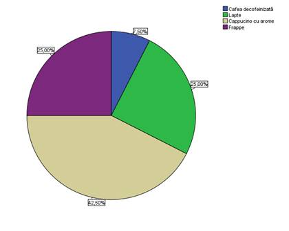 Cu aceasta intrebare se poate pregati aprovizionarea automatelor cu un nou sortiment de bautura si depinde in totalitate de intrebarea anterioara. Astfel 42,50% vor cappucino cu arome, 50% vor frappe sau lapte, iar 7,50% vor cafea decofeinizata.