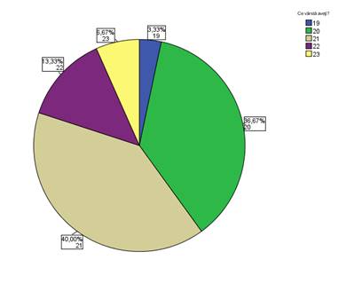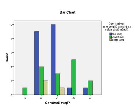 Relevanta acestei intrebari se refera la faptul ca putem estima varsta medie a consumatoriilor de cafea din randul studentiilor. Astfel 40% din respondenti au 21 de ani, 36,67% au 20 de ani, 13,33% au 22 de ani, 6,67% au 23 de ani, 3,33% au 19 ani.