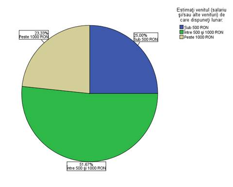 Aceasta intrebare este utila in cazul unor corelatii cu intrebarea anterioara si cu tipul de cafea consumat, dar si cu locul unde se consuma cafeaua. Astfel s-a stabilt ca 51,67% din respondenti au un venit lunar intre 500 si 1000 RON, 25% au un venit lunar sub 500 RON, iar 23,33% au un venit lunar peste 1000 RON.