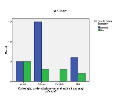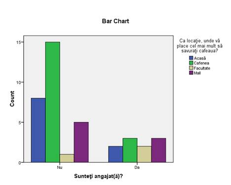 O alta corelatie pe care noi am considerat-o importanta este aceea intre locul in care se consuma cafeaua si statutul de angajat sau nu al studentiilor. S-a constatat faptul ca din totalul celor care au raspuns la chestionare o buna parte dintre cei care nu lucreaza cosnuma de obicei cafeaua in cafenele iar cei care sunt deja angajati isi consuma cafeaua in cafenele si in mall, dar numarul celor care nu lucreaza este mult mai mare.