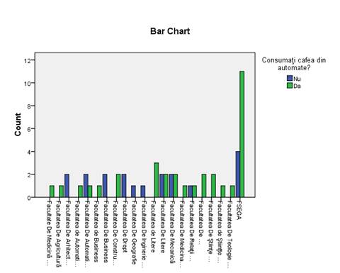4. Am dorit sa descoperim daca exista vreo legatura intre facultatea la care studiaza si consumul de cafea din automate, rezultatul fiind acela ca nu exista ceea ce este un lucru pozitiv, concluzia fiind aceea ca exista echilibru intre numarul automatelor din fiecare facultate si chiar intre amplasarile lor.