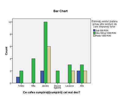 6. Observam ca nu exista legatura intre venitul lunar si marca de cafea cumparata. Acesta este un lucru pozitiv prin faptul ca actualele marci de cafea distribuite satisfac cererea clientilor.