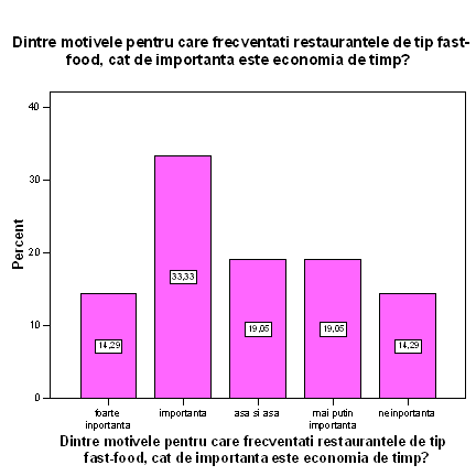 Pentru 14,29 % dintre persoanele chestionate, economia de timp constituie un motiv foarte important in alegerea restaurantelor de tip fast-food, in timp ce 14,29% o considera neinportanta economia de timp in alegerea uniui astfel de restaurant.