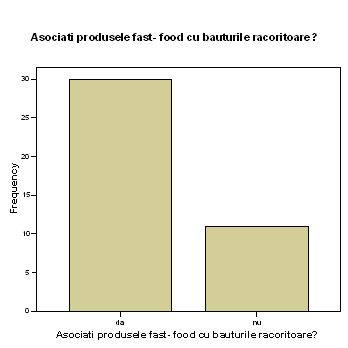60% dintre cei chestionati au declarat ca asociaza produsele fast- food cu bauturile racoritoare, in timp ce 22% au declarat ca nu le asociaza.