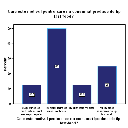 Din cele 8 persoane chestionate care nu consuma produse fast-food, 50% nu consuma din cauza numarului mare de calorii pe care il contine aceasta mancare, 25% nu consuma alimente fast- food pentru ca nu le place aceasta mincaren12,5% di cauza suspiciunii ca mancarea nu este mereu proaspata si 12,5 % nu consuma aceasta mancare din morive medicale.