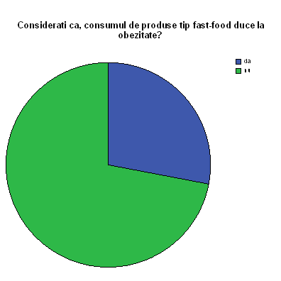 72% din cei intervievati considera ca mancarea de tip fast-food nu duce la obezitate, in timp ce 28% considera ca mancarea de tip fast-food duce la obezitate.