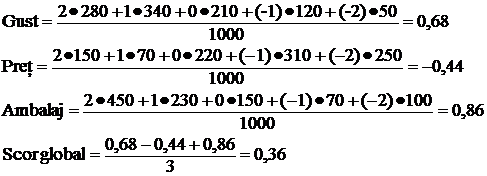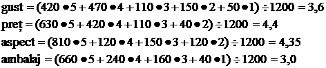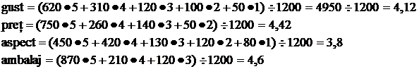 Aprecierile consumatorilor prezentate an tabelul de mai sus se incadreaza intr-o scala cu 5 trepte (diferentiala semantica). Se va calcula pentru fiecare parametru cate o medie aritmetica ponderata a aprecierilor, acordand note de la 1 (foarte nefavorabil) la 5 (foarte favorabil) dupa cum urmeaza: