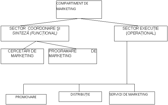 b) Organizarea arborescenta a compartimentului de marketing, presupune doua sau mai multe trepte de organizare; compartimentul de marketing este structurat in doua sectoare: sectorul functional; sectorul operational.