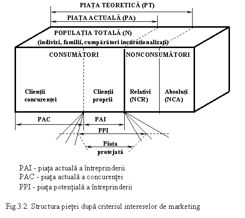 In alte imprejurari, ei pot deveni consumatori si cumparatori efectivi, cel putin in parte. Daca din marimea pietei (N) se scade numarul nonconsumatorilor absoluti (NCA), ceea ce ramane reprezinta piata teoretica (PT), formata din numarul maxim de consumatori teoretic posibil.