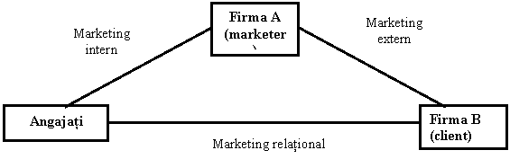 a) Marketingul intern - data fiind importanta personalului participant la realizarea produselor si serviciilor, practicarea cu succes a marketingului este conditionata de eficienta acestei componente. Din aceasta perspectiva se impune investirea in calitatile si performantele angajatilor. Calitatea serviciilor prestate depinde intr-o mare masura de eficienta personalului, de faptul ca acesta trebuie sa fie constient ca formeaza o echipa al carei scop este satisfacerea clientului. Numai in conditiile satisfacerii nevoilor propriilor salariati, marketerul (firma A) poate vorbi despre satisfacerea clientilor (firma B).