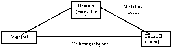 a) Marketingul intern - data fiind importanta personalului participant la realizarea produselor si serviciilor, practicarea cu succes a marketingului este conditionata de eficienta acestei componente. Din aceasta perspectiva se impune investirea in calitatile si performantele angajatilor. Calitatea serviciilor prestate depinde intr-o mare masura de eficienta personalului, de faptul ca acesta trebuie sa fie constient ca formeaza o echipa al carei scop este satisfacerea clientului. Numai in conditiile satisfacerii nevoilor propriilor salariati, marketerul (firma A) poate vorbi despre satisfacerea clientilor (firma B).