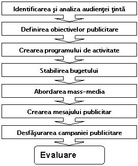 Realizarea unei campanii publicitare impune parcurgerea urmatoarelor etape, ce pot face parte ca sectiuni, din planul de marketing. Parcurgerea fiecarei etape impune asigurarea elementelor manageriale. Succesul campaniei este influentat de modul in care sunt parcurse fiecare etapa, in parte si de parcurgerea in ansamblu a tuturor etapelor, figura 19.1.