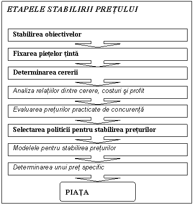 Stabilirea pretului impune parcurgerea unor etape prin care se urmaresc factorii ce actioneaza asupra organizatiei astfel incat, efectul negativ sa fie diminuat iar aspectele pozitive sa fie amplificate pentru ca beneficiile socio-economice sa fie maxime. Principalele etape parcurse in stabilirea pretului unui produs sunt redate mai jos.