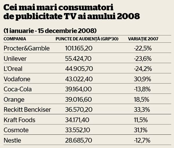 In anul 2008, primii trei clienti publicitari din topul celor mai mari consumatori de reclame TV au alocat bugete mai mici decat in 2007: Procter&Gamble (scadere de 22,5%), Unilever (23,6%) si LOreal (24,2%).