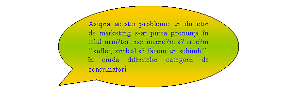 Produsele industriale care se plang de fapt cǎ neachizitionarea lor este determinatǎ de rationamente pur economice pot avea si ele, ordinatoarelor, care trebuie sǎ sugereze imaginea de eficacitate tin sǎ precizeze numele calculatorului - Compaque, IBM. Dacǎ un continut simbolic al produselor variazǎ de la un individ la altul, el se modificǎ si in timp. Se poate afirma cǎ acest continut se bucurǎ de o dinamicǎ anume, cu ajutorul specialistului in imagine. In cultura poporului roman, acest produs este de strictǎ necesitate in momentul de fatǎ. Nu numai marketingul utilizeazǎ aceste simboluri, dar se cautǎ prin publicitate sǎ fie conservate si imbogǎtite. Politica de produs reprezintǎ conduita pe care o adoptǎ firma referitor la dimensiunile, structura si evolutia gamei de produse si servicii ce fac obiectul propriei sale activitǎti, atitudine ce se raporteazǎ permanent la cerintele mediului de piatǎ, la tendintele manifestate de ceilalti concurenti. Strategiile de produse semnificǎ principalele directii in care firma poate sǎ-si mobilizeze resursele pentru a realiza indicatorii economico-financiari pe care si i-a fixat. In cadrul acestor directii strategice, produsul reprezintǎ obiectul central asupra cǎrora actioneazǎ totalitatea fortelor motrice ale firmei si mediului. Activitǎtile componente ale politicii de produs pot fi grupate, dupa continutul tematic, in urmǎtoarele ansambluri: