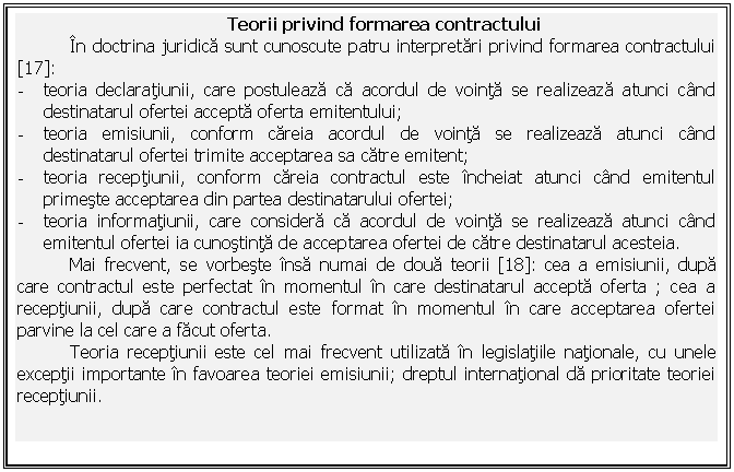 Mai frecvent, se vorbeste insa numai de doua teorii [20]: cea a emisiunii, dupa care contractul este perfectat in momentul in care destinatarul accepta oferta ; cea a receptiunii, dupa care contractul este format in momentul in care acceptarea ofertei parvine la cel care a facut oferta.