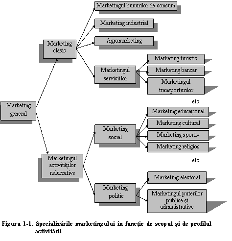 Cel de-al doilea criteriu, al profilului activitatii, este si cel mai important. Prin aplicarea lui, se contureaza patru domenii de specializare in sfera activitatii economice (marketingul bunurilor de consum, marketingul industrial, agromarketingul si marketingul serviciilor) si doua in sfera activitatilor nelucrative (marketingul social si marketingul politic). Rezultatul aplicarii simultane a acestor doua criterii, cel al scopului si cel al profilului activitatii, este prezentat in figura 1-1.