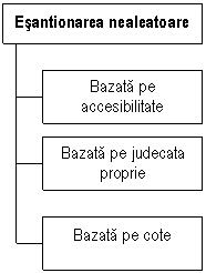 Dupa definirea esantionului, urmeaza alegerea metodei de esantionare, dintr-o paleta destul de larga (figura de mai jos). Cand nu exista posibilitatea cunoasterii probabilitatii ca o unitate a colectivitatii sa fie selectionata, se apeleaza la procedee de esantionare nealeatoare, in care procesul selectiei este cel putin partial subiectiv. De exemplu, pentru cunoasterea nevoilor de cumparare la un anumit produs se organizeaza o cercetare selectiva in cinci magazine; alegerea magazinelor si a cumparatorilor care urmeaza a fi chestionati se lasa la latitudinea cercetatorului. In general, esantionarea nealeatoare se foloseste in cercetari exploratorii, cand problema reprezentativitatii are o importanta mai redusa. De obicei, se recurge insa la esantionarea aleatoare, respectiv, selectia se realizeaza independent de cercetator, fiecare element al colectivitatii avind aceeasi probabilitate de a fi inclus in esantion. De data aceasta se pot calcula intervalele de incredere, se pot realiza testele de semnificatie si se pot face estimari nedistorsionate ale valorilor caracteristicilor la nivelul intregii colectivitati investigate.