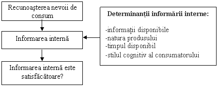 Informarea interna consta in utilizarea informatiilor disponibile in memoria consumatorului. Daca informatiile existente in memoria consumatorului sunt suficiente, pentru ca ele sa conduca la adoptarea unei decizii, informarea externa devine inutila. Importanta informarii interne depinde de situatia de cumparare, natura produsului, directia si intensitatea informarii. In situatia in care consumatorul dispune de putin timp, pentru a adopta o decizie, el nu are alta solutie decat sa se increada in propria memorie ( deteriorarea automobilului il poate conduce pe consumator sa apeleze la informatii stocate in memorie-ultimul service auto la care l-a reparat). Timpul scurs de la ultima cumparare il poate determina pe consumator sa se multumeasca sau nu cu informatiile existente in memorie (daca acest timp este scurt consumatorul va renunta probabil la informarea externa). De asemenea, daca consumatorul a fost satisfacut de cumpararea anterioara informarea interna poate fi suficienta.