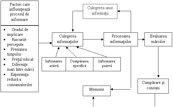 Surse comerciale Surse necomerciale (Sursa: Thomas S. Robertson, Joan Zialinski, Scott Ward, "Consumer Behavior" 1984, citati de Henry Assael) A treia caracteristica a procesului de informare este succesiunea cercetarii, care se refera la ordinea activitatilor de informare si la ordinea in care sunt achizitionate informatiile privitoare la produse, marci. Prima marca examinata nu va fi intotdeauna si cea cumparata, ea va oferi consumatorului informatii esentiale in ceea ce priveste categoria de produse din care face parte. Din aceasta cauza ea va fi o marca cu o rata de notorietate ridicata si cu o imagine foarte favorabila, iar pe baza informatiilor pe care ea le ofera consumatorului va compara si alte marci mai putin cunoscute dupa care va cumpara una dintre ele. In ceea ce priveste ordinea achizitiei informatiilor consumatorul poate apela la trei proceduri: -culegerea informatiilor referitoare la toate atributele unei marci si continuarea acestui proces cu o a doua, a treia , a patra marca ( tratamentul pe marci); -culegerea informatiilor referitoare la un atribut, pe baza caruia se compara toate marcile considerate, dupa care procesul continua cu al doilea, al treilea,. al patrulea atribut (tratamentul pe atribute); -culegerea alternativa a informatiilor prin care consumatorul compara doua, trei marci pe baza unui singur atribut, dupa care va incerca sa obtina informatii asupra tuturor atributelor unei marci. Alegerea anumitor surse de informatii, recurgerea la o anumita cantitate de informatii si apelarea la o procedura sau la alta de achizitionare a informatiilor sunt influentate de o varietate de factori. Ioan Plaias imparte factorii care influenteaza procesul de informare in urmatoarele categorii: caracteristicile produsului, caracteristicile comertului, caracteristicile consumatorului. Caracteristicile produsului, care influenteaza procesul de informare sunt: gradul de diferentiere dintre marci, pretul produsului, stabilitatea categoriei de produse. In cazul in care consumatorii considera ca marcile existente pe o piata sunt asemanatoare, procesul de informare va fi limitat, necesitatea informarii crescand pe masura ce marcile sunt distincte. Pretul produsului este un alt factor care influenteaza procesul de informare, deoarece, cu cat pretul este mai mare, cu atat sunt mai mari riscurile financiare, si in consecinta, procesul de informare este mai amplu. Acest factor este legat si de notiunea de cost beneficiu, cu cat economia realizata ( beneficiul) este mai mare cu atat mai probabil ca se va realiza o informare suplimentara (costul). Stabilitatea pietei poate afecta procesul de informare. Astfel, consumatorii se pot bizui mai mult pe cunostintele acumulate atunci cand ei cumpara produse care sufera modificari lente in timp. Dimpotriva, atunci cand cumpara produse care sufera modificari frecvente sunt nevoiti sa apeleze la o informare suplimentara, pentru a-si actualiza informatiile stocate in memorie. Procesul de informare este diferit si in functie de natura cumpararii, bunuri sau servicii. Ca urmare a faptului ca, in general, consumatorii percep un risc mai mare in cumpararea serviciilor decat in cea a bunurilor, procesul de informare poate fi diferit. Influenta comertului asupra procesului de informare este data, in primul rand de distanta fizica dintre magazine, care poate determina numarul de magazine vizitate de catre consumatori pentru pregatirea deciziei de cumparare. Asemanarile si deosebirile dintre magazine pot influenta, de asemenea procesul de informare, acesta fiind mai intens atunci cand consumatorii percep diferente mari intre magazine ( mai ales in ceea ce priveste preturile de vanzare). Procesul de informare se poate desfasura in mod diferit in functie de caracteristicile consumatorilor. Aceste caracteristici includ experienta, implicarea si riscul perceput, atitudinile, caracteristicile social-economice si demografice. Experienta consumatorilor poate avea efecte contradictorii asupra procesului de informare. Ea poate conduce, pe de o parte, la intensificarea si extinderea procesului de informare, iar pe de alta parte la limitarea acestui proces. Ea poate permite consumatorului sa se increada in informatiile stocate in memorie si sa nu mai aiba nevoie de informatii externe. Informarea depinde si de gradul de implicare al consumatorului in adoptarea deciziei. Se considera ca un grad mare de implicare conduce la un proces complex de informare. In cazul cumpararilor caracterizate printr-o implicare redusa cumparatorii inlocuiesc informarea prin cumpararea si incercarea produsului ("Nu ma costa prea mult sa incerc si aceasta marca de ketchup"). Bineinteles ca aceasta este o tactica la care apeleaza consumatorii atunci cand produsele cumparate au un pret relativ redus. Natura si importanta riscului perceput determina nevoia de informare a consumatorilor. Acestia cauta surse, informatii in cantitatea si calitatea care sa le satisfaca nevoile de informare. Analiza riscurilor prezinta un dublu interes: in primul rand permite mai buna intelegere al procesului decizional, iar in al doilea rand permite managerilor intreprinderii sa reduca riscurile percepute de consumatori. Consumatorul se angajeaza intr-o informare externa atunci cand el apreciaza ca avantajele acesteia sunt suficient de mari pentru a compensa costurile obtinerii lor. Avantajele pe care le asteapta consumatorul pot fi tangibile si intangibile. Cele tangibile sunt date de reducerile de pret, de o mai buna calitate a produsului, iar cele intangibile de reducerea riscului perceput, de o mai mare incredere in propria judecata. Procesul de informare poate varia, ca intensitate si structura, si in functie de caracteristicile demografice, socio-economice si psihografice ale consumatorilor. Consumatorii aflati la o varsta mai inaintata apeleaza, in primul rand la experienta lor si sunt mai indiferente fata de informatiile care se vehiculeaza in mediul lor. Consumatorii care dispun de venituri mari apeleaza la