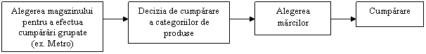 (Sursa: Lambrey Blandine, citata de Marc Filser) Prima situatie este cea a procesului decizional clasic, insa ea are in vedere efectul absentei marcii din magazin ( consumatorul merge, de exemplu, in magazinul Etti din Timisoara pentru a cumpara mustar Rotina, dar nu gaseste marca preferata si va cumpara alta marca disponibila in magazin). A doua situatie descrie procesul in care consumatorul isi stabileste inaintea intrarii in magazin felul produsului pe care-l va cumpara ( de exemplu, un aspirator) si va alege o marca in magazin, in functie de oferta existenta ( Rowenta, Phillips). Procesul decizional se descompune in 2 faze: alegerea produsului, efectuata inaintea vizitarii magazinului si alegerea marcii in magazinul vizitat. A treia situatie corespunde unui comportament de grupare a cumpararilor in cadrul unei vizite planificate in magazin.