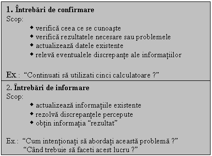 Scopul acestor intrebari, precum si exemplele specifice fiecarui tip de intrebare in parte sunt prezentate in continuare. Un agent de vazari experimentat va utiliza cu succes aceste tipuri de intrebari, adaptandu-le unei situatii concrete.
