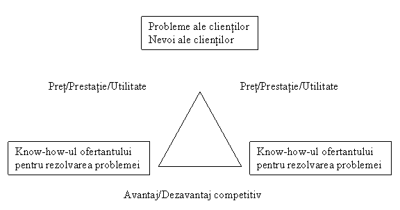 Marketingul aseaza in triunghiul strategic (figura nr. 1) atat clientii, cat si intreprinderea, si concurentii, si incearca sa ofere clientilor - in raport cu concurenta - avantaje referitoare la prestatii si/sau preturi. Aceste avantaje sunt deseori, dar nu in fiecare caz, controlabile. Este de ajuns ca o prestatie sa fie catalogata de clienti ca fiind mai buna si/sau mai ieftina. Aceasta se poate intampla atunci cand, de exemplu, clientul evalueaza competenta ofertantului ca fiind mai buna decat a concurentilor, si prin aceasta se simte mai bine sfatuit sau atunci cand comunicarea dintre ofertant si consumator este facilitata de simpatia personala, de intelegerea mentalitatii partenerului etc., decat intre consumator si alti ofertanti. Din punct de vedere subiectiv, clientul considera ca evalueaza mai bine calitatea consilierii si a serviciilor, chiar daca din punct de vedere obiectiv acest lucru nu corespunde realitatii. Si aspectele de design ale unui bun pot influenta evaluarea calitatii etc.