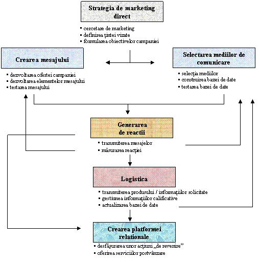 modelului comunicatiei integrate de marketing: conform acestui model, eforturile de marketing direct vor fi integrate in ansamblul eforturilor de comunicare globale ale organizatiei, urmarind sa contribuie, pe de o parte, la atingerea unor obiective specifice dar, mai ales, la maximizarea efectelor generate de demersul global al comunicatiei de marketing al organizatiei.
