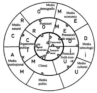 In esenta, orice intreprindere combina trei categorii de factori de productie, intrand in relatii cu tot atatea componente de mediu, respectiv: furnizori de resurse materiale (ori de prestari de servicii), furnizori de resurse banesti (bancile) si furnizori de forta de munca. Din combinare se obtin produse ori servicii care sunt livrate clientilor. In mod similar actioneaza si concurentii intreprinderii din cadrul mediului. Pe langa acestia apar o serie de alti agenti, pe care ii vom denumi generic, organisme publice, care influenteaza in mod similar activitatea intreprinderii.