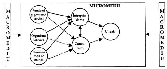 Raportarea eficienta la mediu impune cercetarea atenta a componentelor sale, a interactiunii dintre acestea, precum si a impactului lor asupra pietei si, evident, asupra activitatii intreprinderii. Agentii mediului nu actioneaza insa cu aceeasi intensitate si in aceeasi masura asupra activitatii intreprinderii. Cu unii dintre ei, intreprinderea intra in legaturi directe, impuse de necesitatea realizarii obiectului sau de activitate, influentele fiind de regula reciproce; cu altii, relatiile sunt mai indepartate, mai slabe, influenta acestora fiind de cele mai multe ori indirecta. Agentii cuprinsi in prima categorie formeaza micromediul intreprinderii, ceilalti alcatuiesc componentele macromediului intreprinderii.