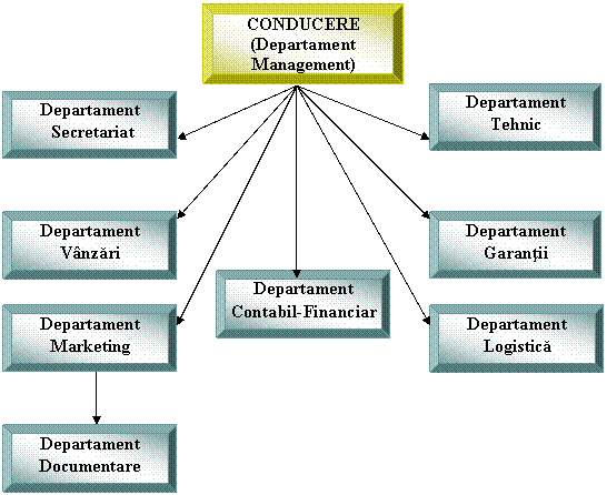 Departamentul de management: la nivelul acestui departament se hotaraste si se actioneaza pentru indeplinirea obiectivelor firmei, se repartizeaza resursele si se gestioneaza fenomenele specifice procesului de munca. Coordonatorul departamentului de management (Mihailescu Catalin, in varsta de 34 ani) este purtatorul de cuvant al firmei in legaturile pe care aceasta le are cu exteriorul. Are rolul de a-i atrage pe angajati in jurul obiectivelor prioritare si de a se implica in problemele legate de satisfacerea clientilor.
