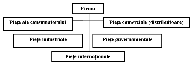 2. Clientii: cei cu care o organizatie doreste sa angajeze schimburi; din aceasta perspectiva firma poate opera cu cinci tipuri de piete ale clientilor care sunt prezentate in figura urmatoare: