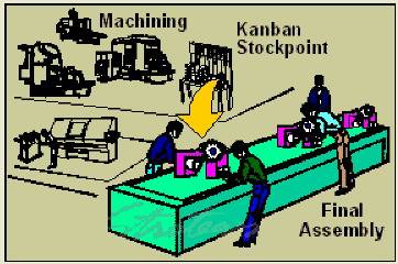 Sa spunem ca una din componentele de care e nevoie o firma sa asambleze un motor este un piston cu diametrul de 85 mm si acestea vin livrati in paleti. Sunt 100 de pistoane intr-un palet. Cand paletul este gol, o persoana care se ocupa cu asamblarea motoarelor ia eticheta lipita de palet si o trimite inapoi la producator. Atunci un alt palet cu pistoane cu diametrul de 85 mm este fabricat si trimis la asamblare.