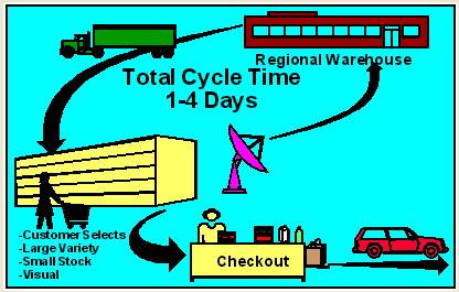 Kanban poate functiona si in cadrul unui supermarket. Un stoc mic necesar functionarii supermarket-ului va fi depozitat in locuri speciale cu spatii riguros delimitate pentru fiecare categorie de marfuri. In momentul in care se vinde un produs, datorita sistemului integrat de gestiune a marfurilor acest lucru este transmis la depozitul central (regional warehouse) astfel ca in orice moment se stie cantitatea exacta a marfurilor. Aprovizionatre la acest supermarket se face o data la 4 zile dar daca se vinde o cantitare mare dintr-un produs acest lucru este semnalat la depozitul central si se va face o aprovizionare mai rapida (chiar si in fiecare zi