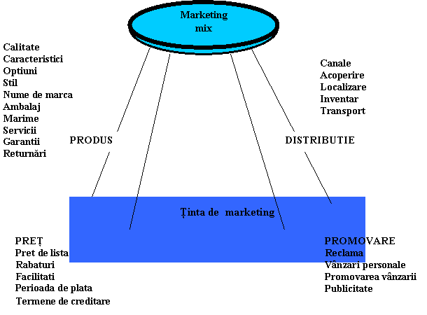 Definirea unei politici de marketing pentru un produs sau serviciu are la baza patru categorii de decizii, care se refera la "componentele marketingului mix", si anume politica de produs, politica de pret, politica de distributie si politica de promovare - vezi fig.14.