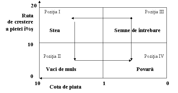 c - prin dezvoltarea afacerii, firma pozitionata in cadranul 3 sau 2, va ajunge in cadranul 4, caracterizat prin lansarea pe piata a unui produs nou (vezi ciclul de viata al produsului).
