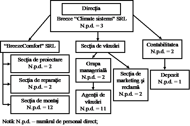 Procesul de comercializare a utilajului climateric este efectuat de Sectia de vanzari, condusa de Directorul comercial, iar procesul de proiectare, montaj si reparatie - de intreprinderea-fiica "Breezcomfort" SRL, in frunte cu Directorul general a acesteia.
