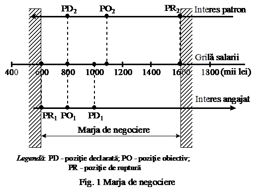 Prin suprapunerea celor trei pozitii de negociere, ale ambilor parteneri, va rezulta o zona in care ei se pot intelege. Aceasta zona de acord posibil poarta numele de marja de negociere si este delimitata de pozitiile de ruptura ale partilor negociatoare. In cazul nostru, negocierile "se rup" sub PR1 = 600 mii si peste PR2 = 1,6 milioane lei. Intre aceste limite, orice nivel de salariu este posibil si depinde doar de abilitatea de negociere a partenerilor unde anume se va realiza acordul.