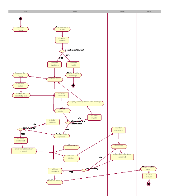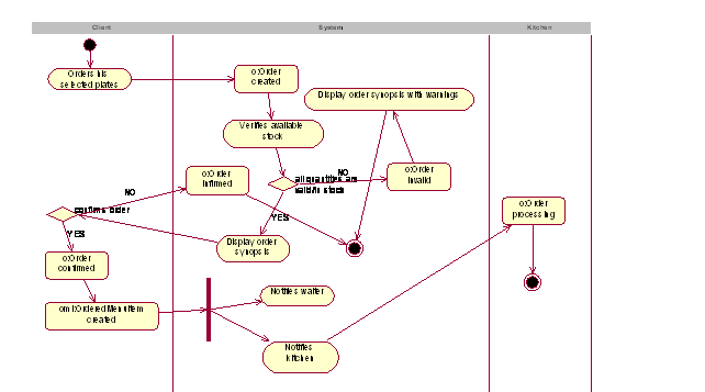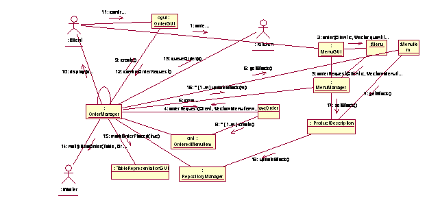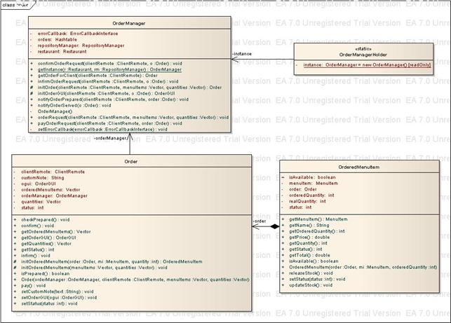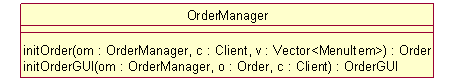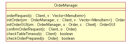 this package contains classes that are used for Place the Orderd and also in the Process the Order use cases. OrderManager is responsible for receiving order requests from the clients, asking for confirmations, sending the orders to the kitchen, permanently checking if the orders are prepared, and notifying the waiters of order status changing and when they must check their tables if too much time has elapsed. OrderManager implements the lazy-loading Singleton pattern. The Order is composed of OrderedMenuItems and contains all information related to a client order, also catches all events from the client regarding his order, events that are delegated to the OrderManager.