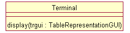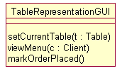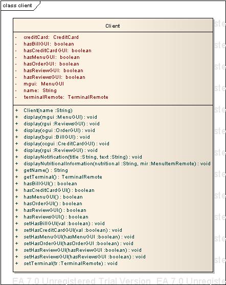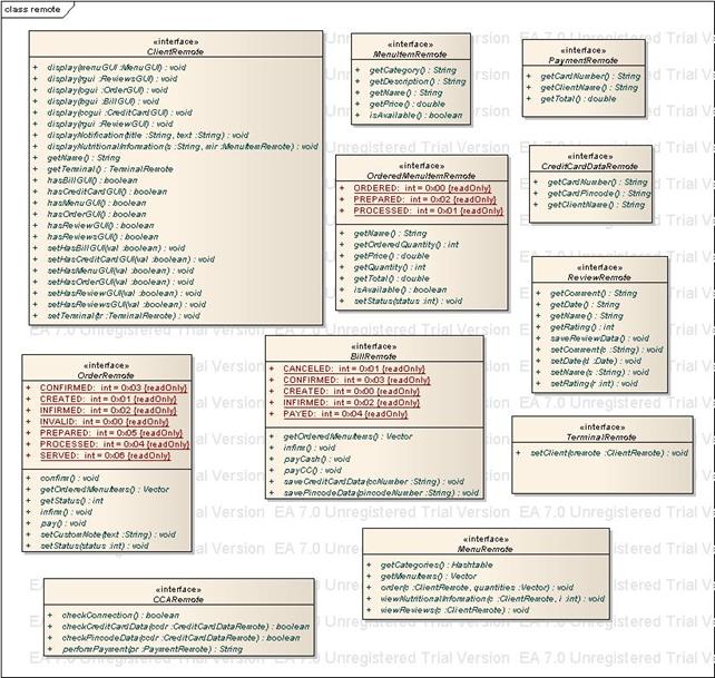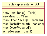 - this is the View component in the Model-View-Controller architecture pattern. Here are defined all graphical interfaces that are displayed by the system. All interfaces that are to be displayed on the remote terminals are to be network-accessible, and this is achieved by extending JFrame (which is a Serializable type (see Marker Interface pattern described earlier) and by using remote interfaces of real objects: TableRepresentationGUI (displays the table representation mapping with the current table button marked yellow), MenuGUI (displays the menu interface), OrderGUI (displays the order interface), BillGUI (displays the bill interface), CreditCardGUI (displays the credit card interface), ReviewGUI (used when writing a review), ReviewsGUI (used to read saved reviews). TableRepresentationGUI also defines an internal class BlinkingThread that will be used when the table button will start blinking to notify that the waiter timeout elapsed. All other interfaces AdministrationGUI (displays the interface that allows the administrator to enter the Configure the System use case), ConfigurationGUI (interface allowing editing the configuration of the system) and AuthenticationGUI (admin authentication interface) are used for editing the system configuration. ConfigurationGUI also defines three internal classes IntegerEditor (used to restrict entering values in a table cell to an integer value), DoubleEditor (used to restrict entering values in a table cell to double value), and UniqueStringEditor (used to restrict entering unique per column values in a table).