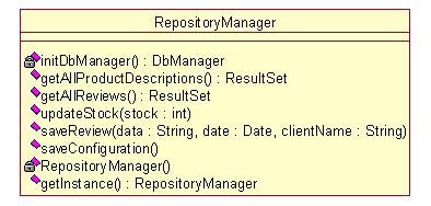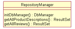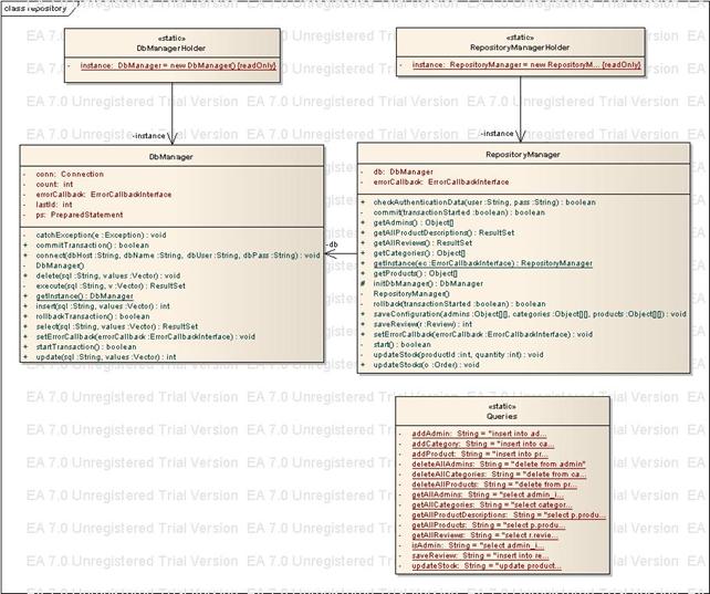 - this package contains the logic for accessing the repository information (in our example, the MySQL database instance). It is part of the Model component in the Model-View-Controller pattern. The package has a manager class RepositoryManager which handles all requests to the repository from the system. It uses DbManager to perform mysql queries in the database. Both classes implement the Singleton lazy-loading pattern earlier described. RepositoryManager defines an internal class Queries which holds all the queries that are executed through DbManager in the database instance.