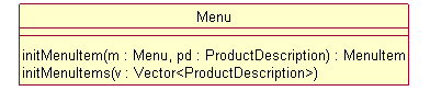 - contains all the classes needed to realize the Browse the Menu use case. ProductDescription is a class enclosing all information of a product from the repository and provides methods for reserving/releasing quantities for a client order. The Menu is composed of MenuItems which reference ProductDescriptions and catches events from the client regarding the menu and sends them to the MenuManager. The MenuManager is the controller for the Browse the Menu use case and handles all requests for a Menu and MenuItems. MenuManager and Menu both implement the lazy-loading Singleton pattern.