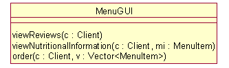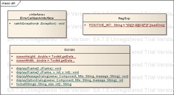 - contains useful classes that are independently used by other classes in the system, and have no connection to the restaurant as a system. GUIUtil defines some common methods for laying out interfaces. RegExp contains regular expressions formats. ErrorCallbackInterface is an interface that can be implemented by any class that wants to act as an error catcher for some operations.