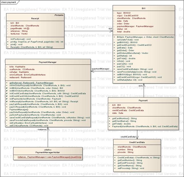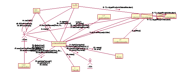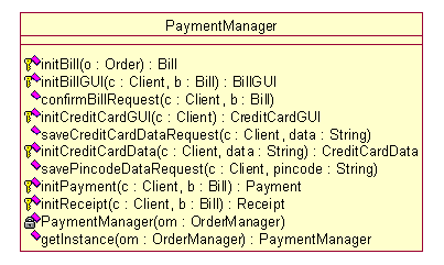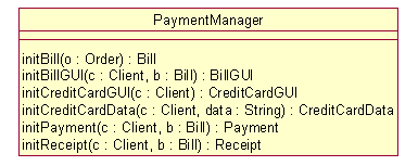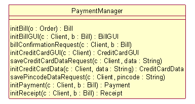 - this package contains classes that are used in the Pay by Credit Card use case. PaymentManager is the controller of the class, and is responsible of getting credit card information from the client, communicating with CCA for validity of the client data, and for creating and printing the bill. PaymentManager implements the lazy-loaded singleton pattern. Bill contains all information regarding the bill for a client. Receipt is the class that prints the receipt of a payment information of a bill. CreditCardData is an object used in the communication with CCA to allow checking of credit card validity for a client. Payment is the information sent to CCA to perform a payment into the client account.