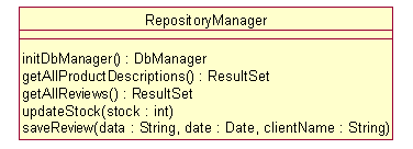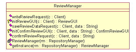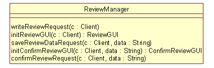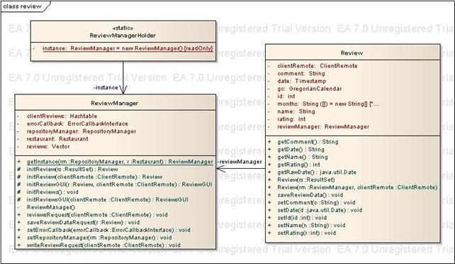 this package contains classes that are used for Review the Restaurant use case. ReviewManager is the controller of the use case and is responsible for displaying reviews to the clients, and to save new reviews into the repository. Review is the representation of a review from the repository. RepositoryManager implements the lazy-loading Singleton pattern